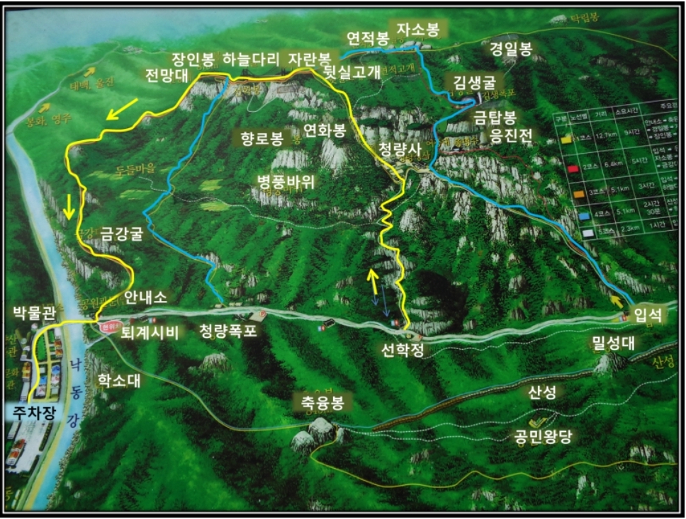 등산코스 : 안내소~금강굴~장인봉~하늘다리~자란봉~청량사~선학정~안내소(7.2km)